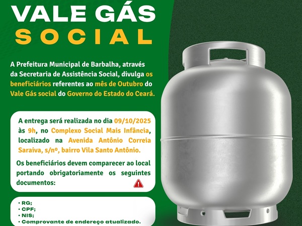 A Prefeitura Municipal de Barbalha, por meio da Secretaria de Assistência Social, informa que a entrega do Vale Gás S [...]