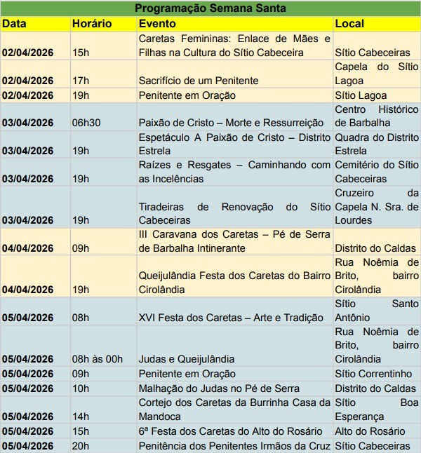 Com uma programação diversa, repleta de manifestações culturais de diferentes categorias, em diferentes locais do município, a prefeitura de Barbalha, por meio da Secretaria de Cultura, divulga a programação completa da Semana Santa 2026. Com 16 apresentações ao todo, se dividem nas seguintes categorias: Caretas, Malhação de Judas, Encenação da Paixão de Cristo (Adulto e InfantilO, Incelências, Rezadeiras e Penitentes.